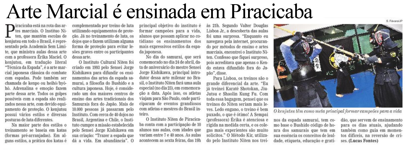Caso a Erika já não tenha mandado, sexta-feita, eu fui treinar com eles em Piracicaba e ocorria uma reportagem no Jornal de Piracicaba sobre kenjutsu. Segue um scan da matéria.