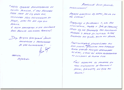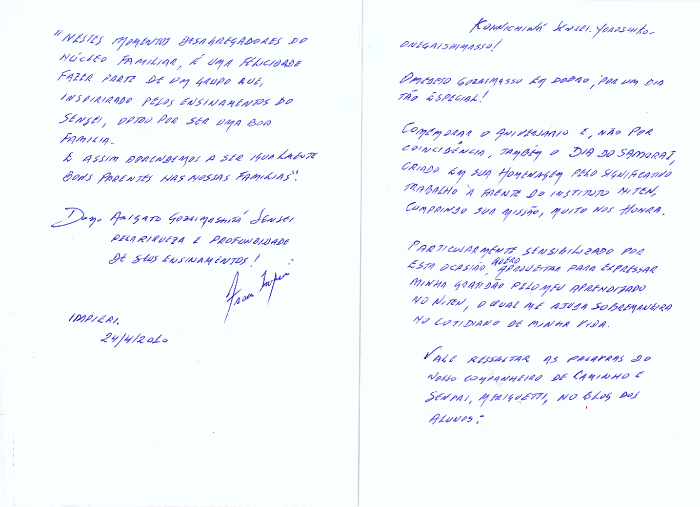 "Desde o retorno de São Paulo, venho me preparando para enviar-lhe minhas impressões sobre um dos melhores aniversários que já passei. Não me sai da cabeça uma pequena frase dita pelo Sensei em um dos E-GANS passados, no qual o Sr. desabafa a respeito de um biru-dô que considerava merecido àquele momento. Numa dessas frases não exatamente com as palavras que agora escrevo para recordar o Sr. dizia: "quero comemorar neste biru-dô algumas coisas importantes, pois muitas coisas perdemos pelo caminho" ou alguma coisa parecida com isso.
